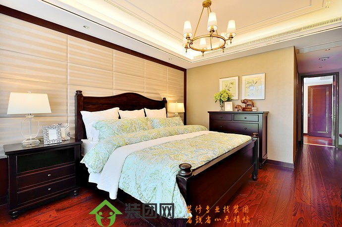 3、美式家居的卧室布置比较温馨,作为主人的私密空间,主要以功能性和实用舒适为考虑的重点,一般的卧室不设顶灯,多用温馨柔软的成套布艺来装点,同时在软装和用色上非常统一。